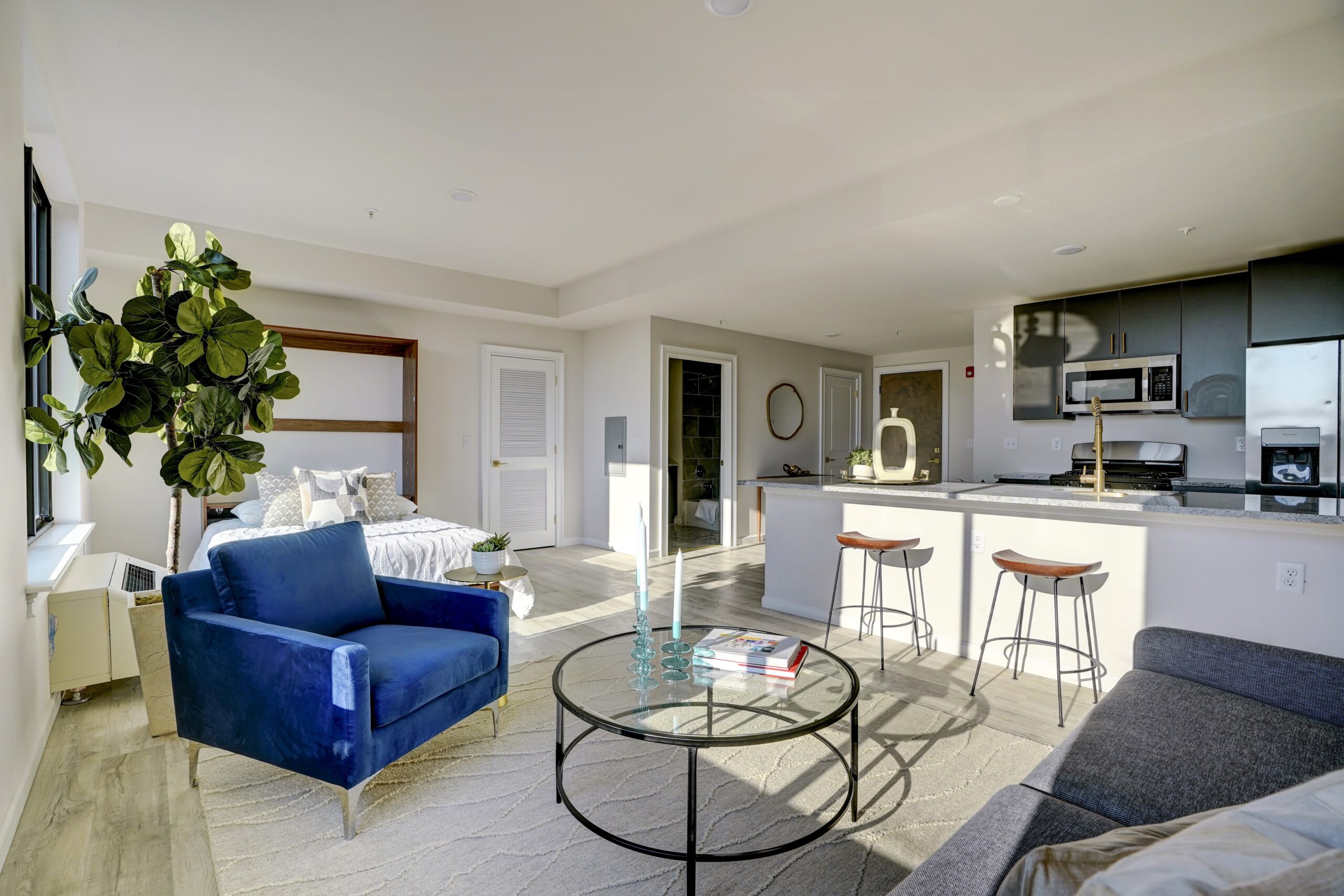The Modern is a luxury high-rise apartment building located at 45 S Grove St in East Orange, NJ 07018. With 5 floors and 119 residential units, it offers a range of apartment layouts, from studios to one- and two-bedroom units, all with modern finishes, stainless steel appliances, in-unit washer and dryer, and large windows with city views.